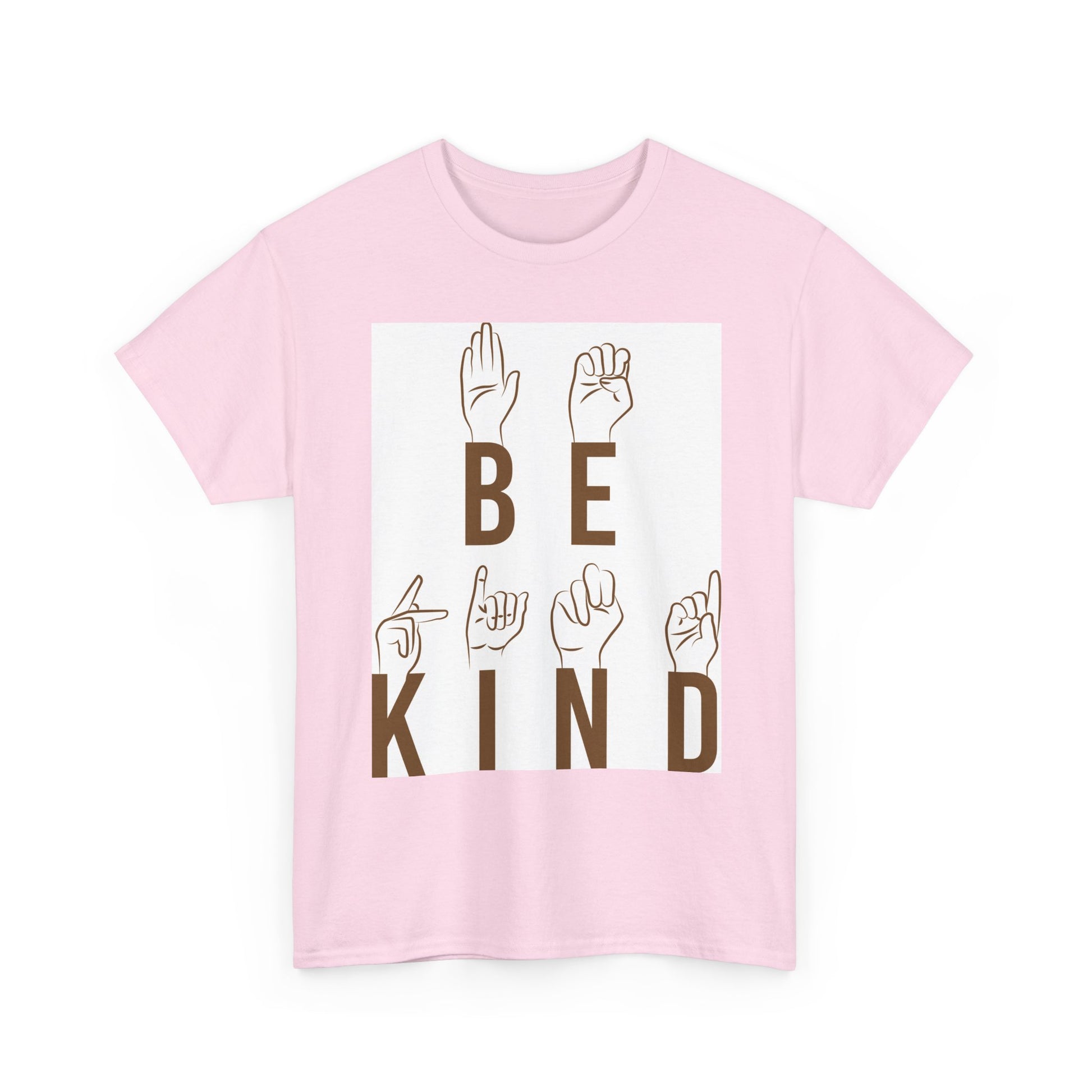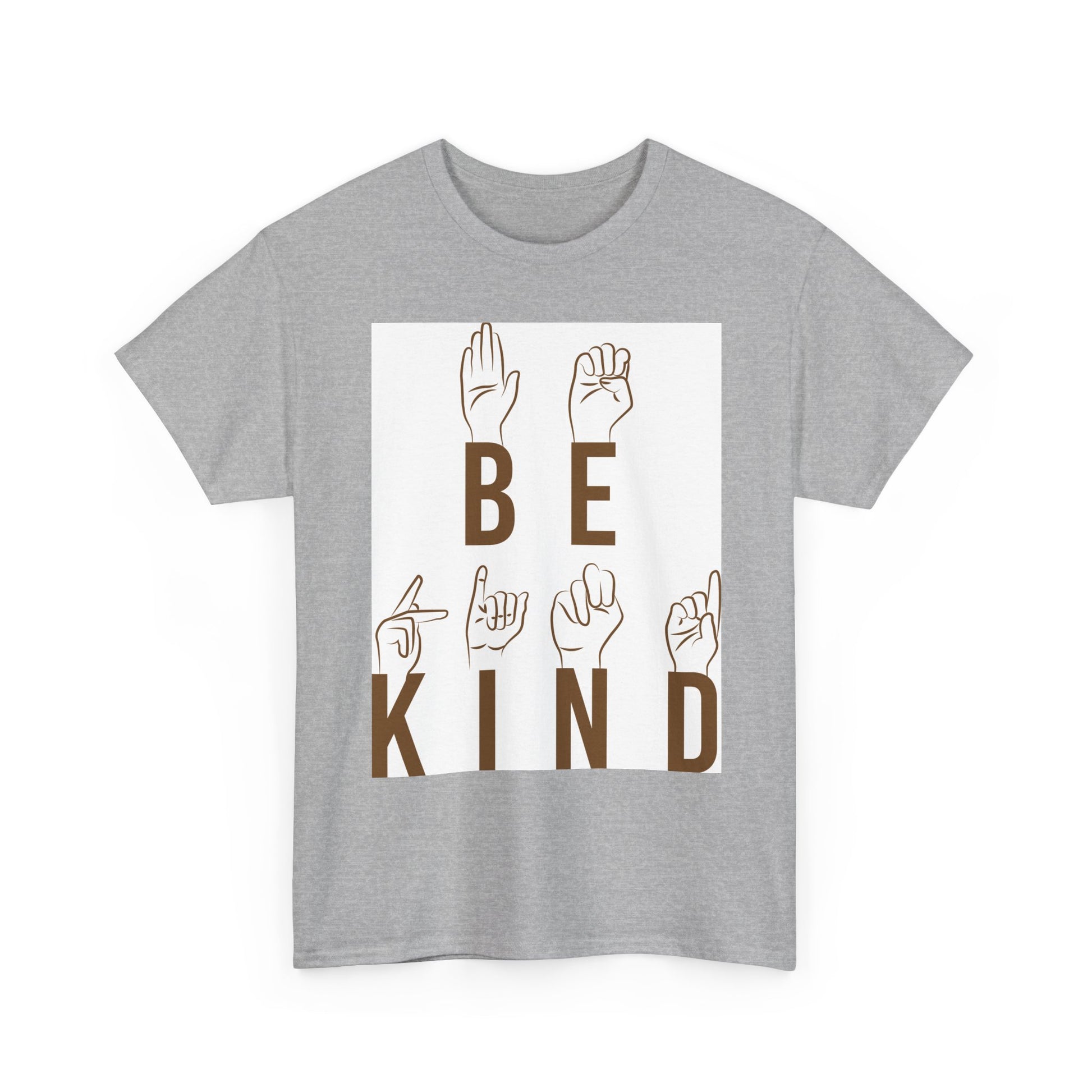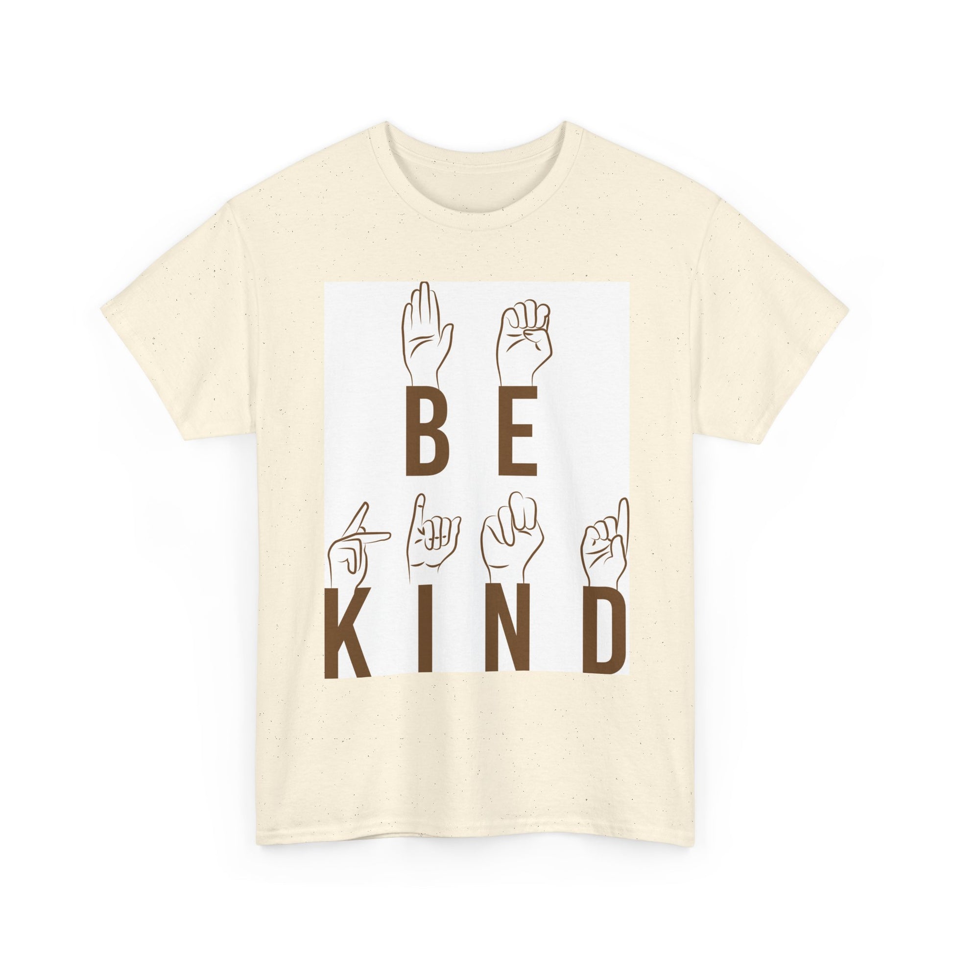 Soft, breathable tee with a calm, positive message—BE KIND—displayed in warm brown letters paired with illustrated hands spelling the words in American Sign Language. The relaxed classic fit and medium-weight cotton feel comfortable all day, whether layered under a jacket or worn solo at a community event, classroom, or relaxed weekend outing. Subtle natural fleck options and a clean, tear-away label keep the shirt comfortable and low-maintenance. This piece speaks gently: an inclusive, everyday reminder that fits into quiet activism, classroom empathy work, or cozy coffee-shop conversations.